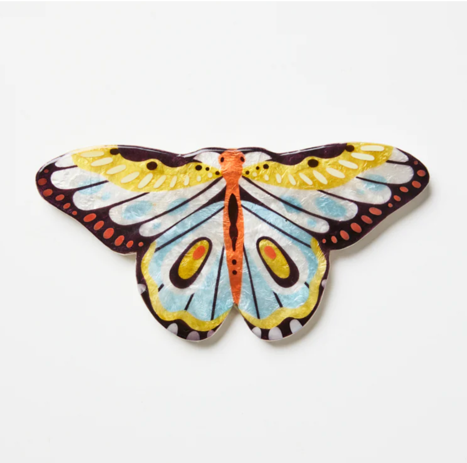 Like sunshine in butterfly form. With cheerful pops of yellow, coral and sky blue, this yellow butterfly wall decor is cut from glowing capiz shell and hand-painted to perfection. A bright idea for bedrooms, playrooms or anywhere that needs a lift. We love it paired with the other Canopy butterflies in a little grouping on the wall.