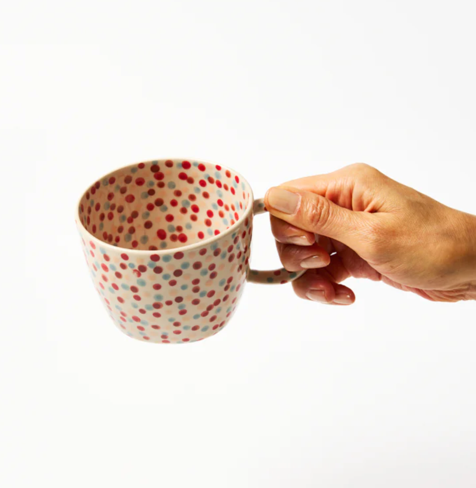 Brighten your daily rituals with the Chino Mug Confetti Sprinkle. Speckled with lively red and blue dots, this handmade earthenware mug combines playful design with practical comfort. Loved for its ergonomic handle and fine, thin ceramic lip, the Chino Mug makes every sip feel refined. Stackable and durable, it's a must-have coffee mug for everyday use.
