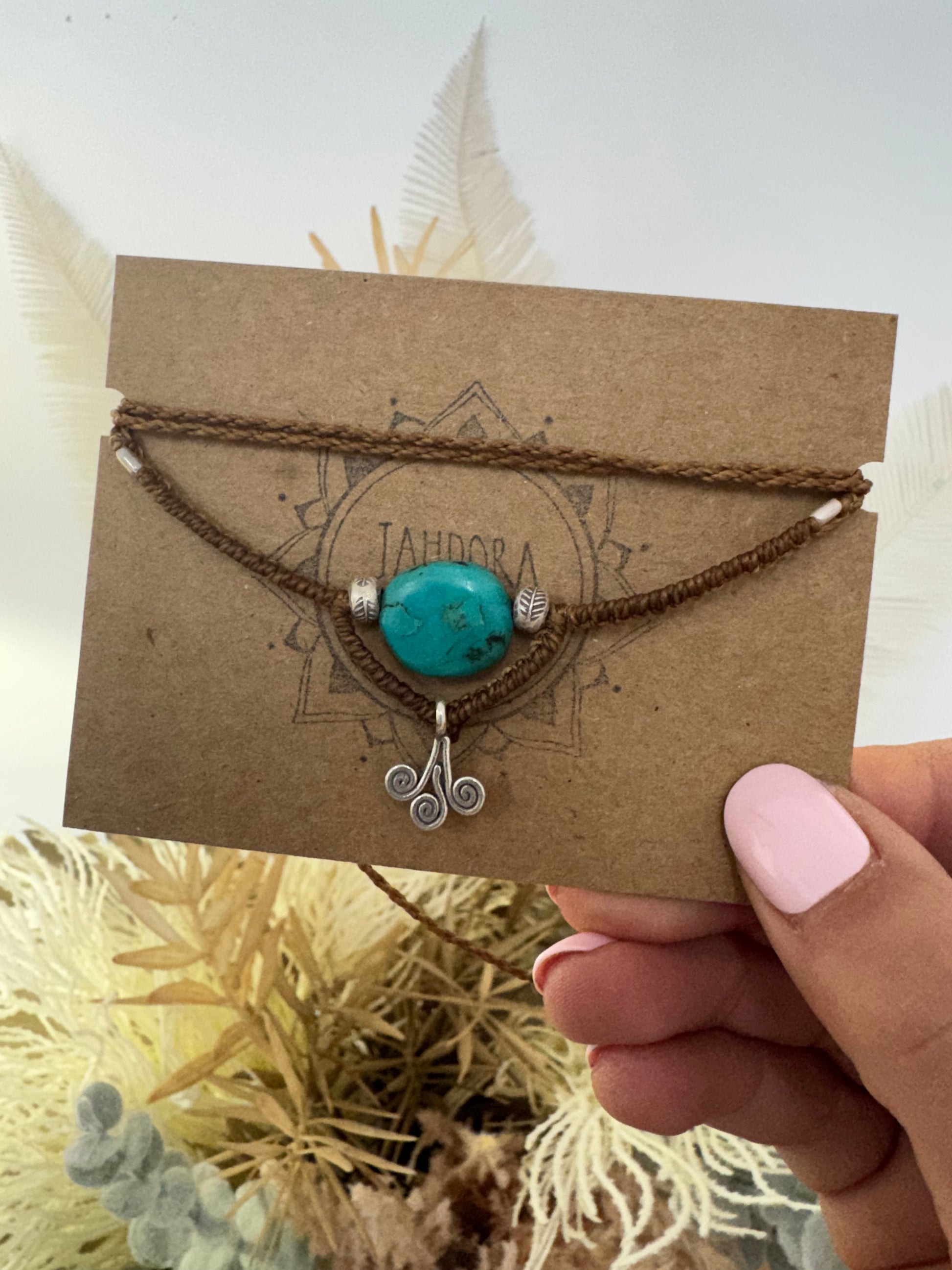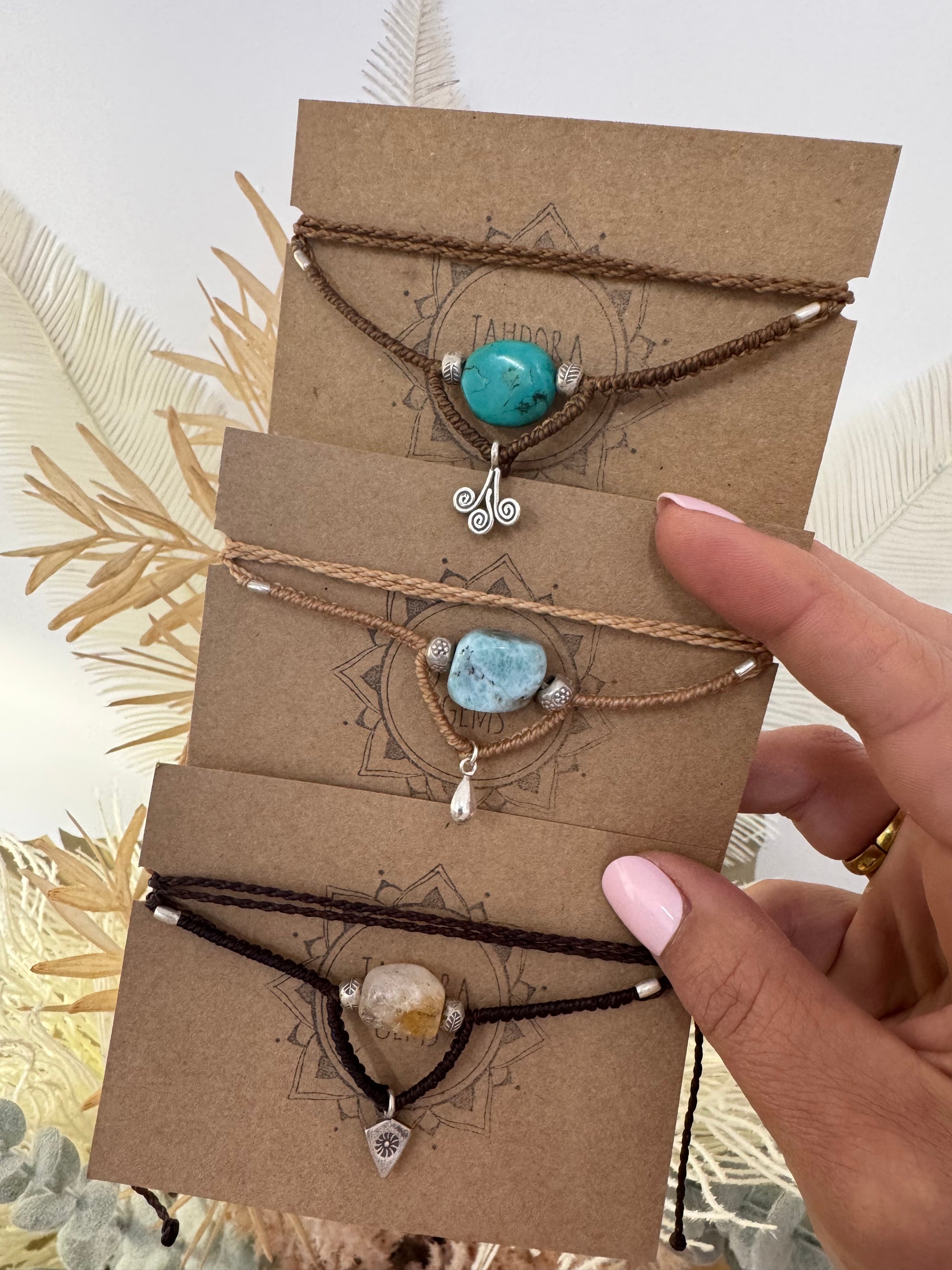Available in Olive, Beige & Brown macrame with precious gemstones in the centre