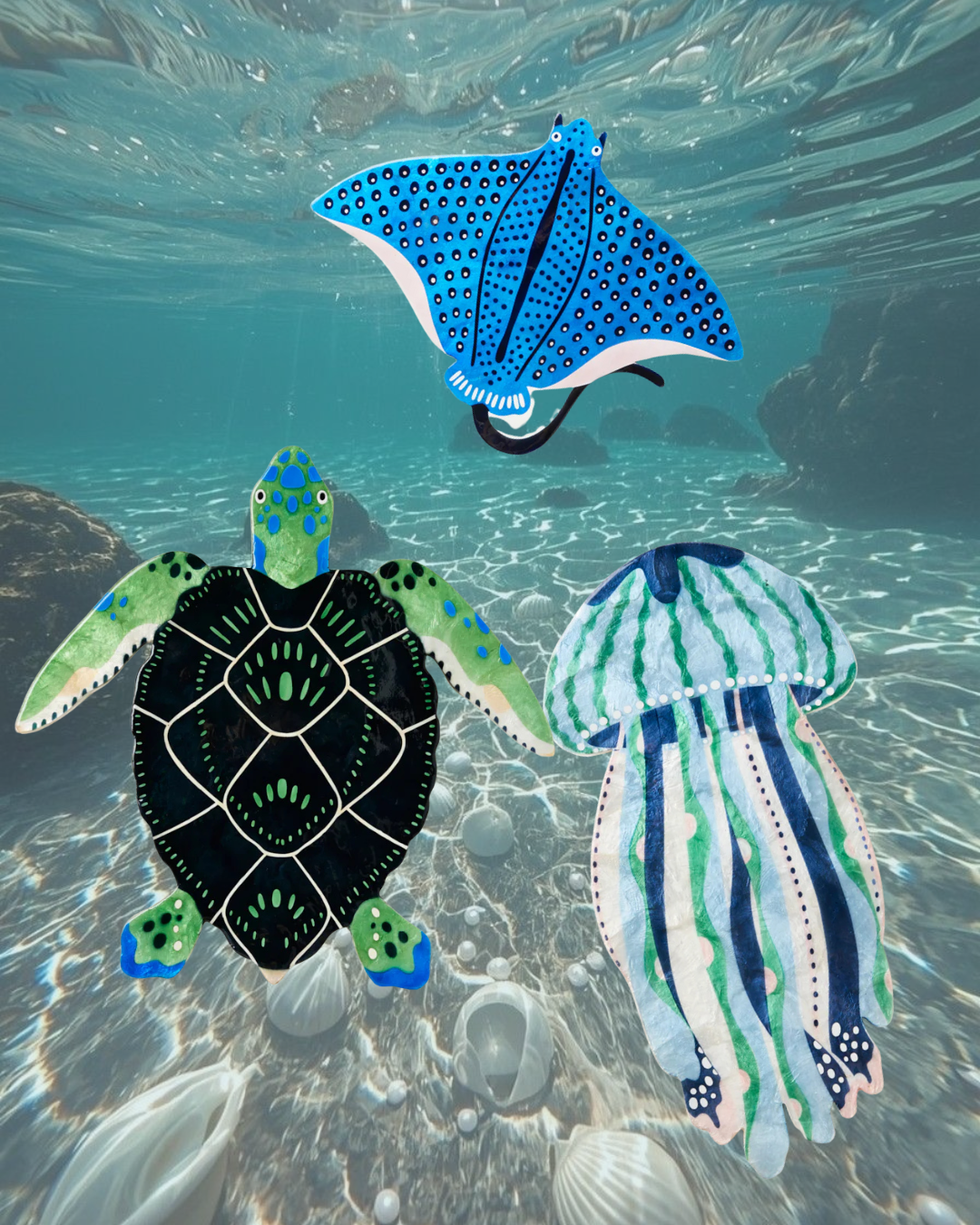 Electric blue spots dance across this stingray, hand-crafted from luminous Capiz shell harvested from Philippine waters. Each piece is meticulously cut and painted by skilled artisans, with the stingray's distinctive form creating dramatic shadow play against your wall. This Sydney-designed statement piece brings underwater magic to your home, its generous scale and hand-painted details ensuring it becomes a commanding focal point in living spaces and coastal interiors.