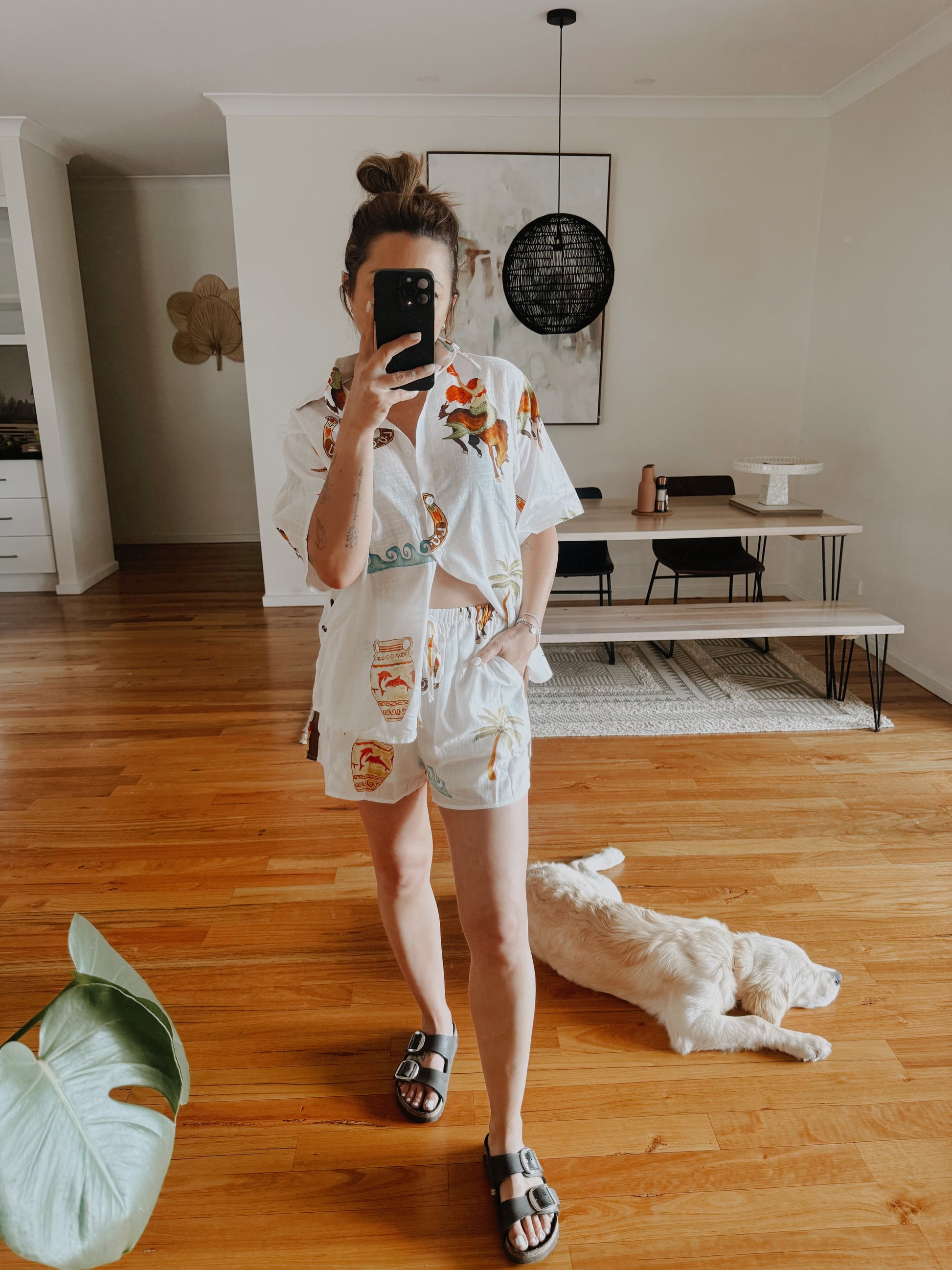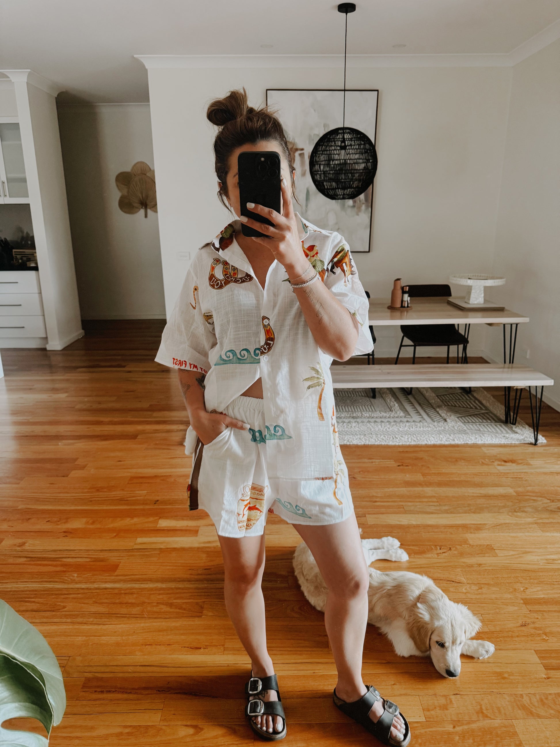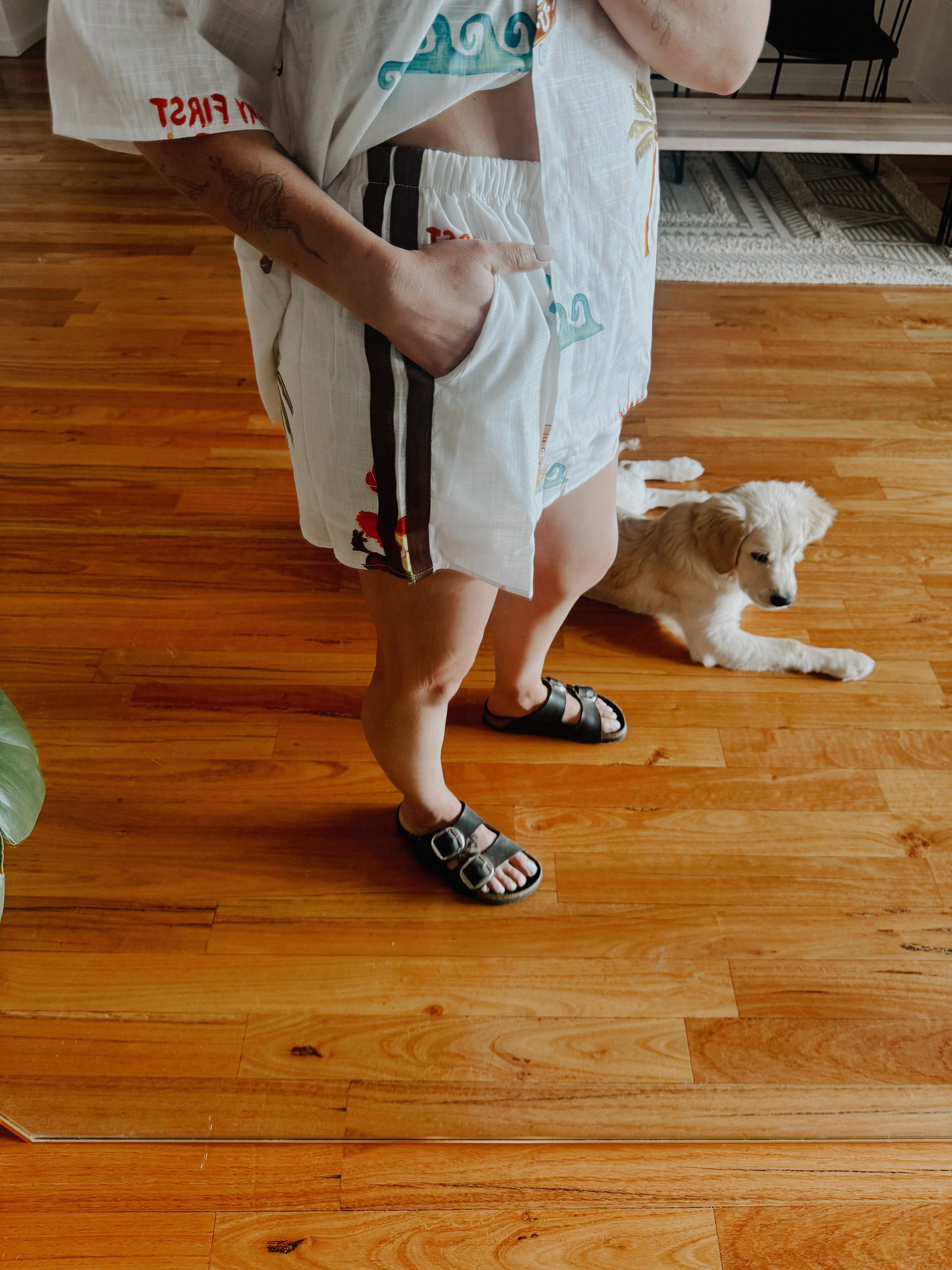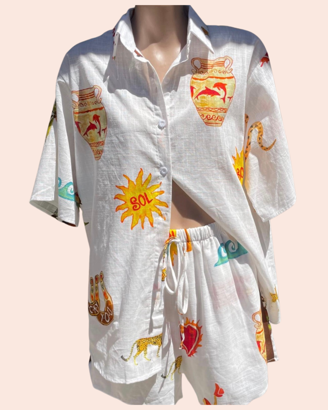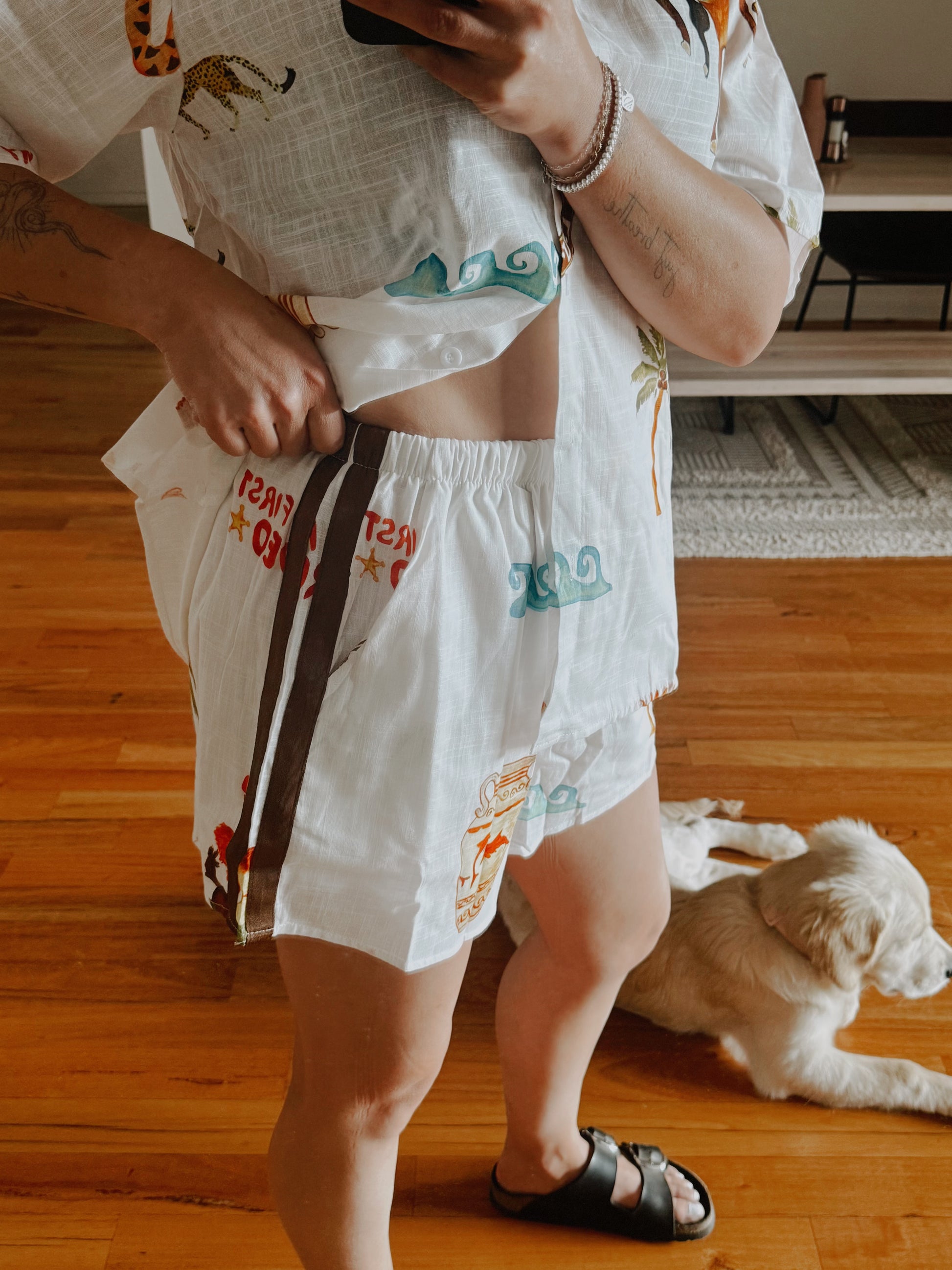 This set is perfect for spring/summer everyday wear or parties. 100% cotton, pockets and shorts are lined. Shorts also have a brown stripe detail down the leg.