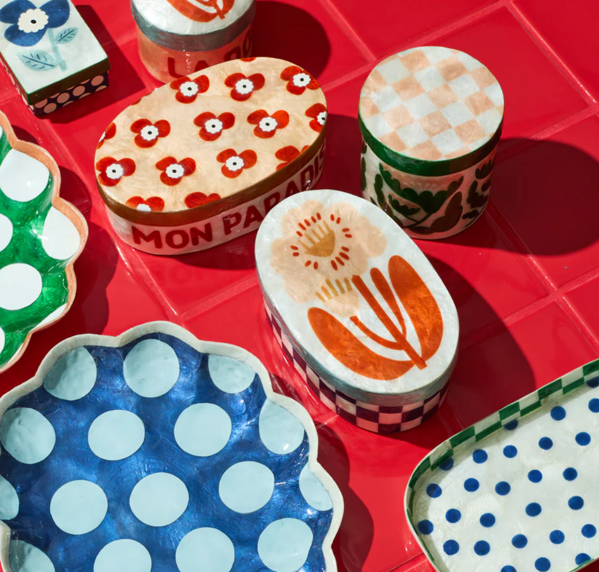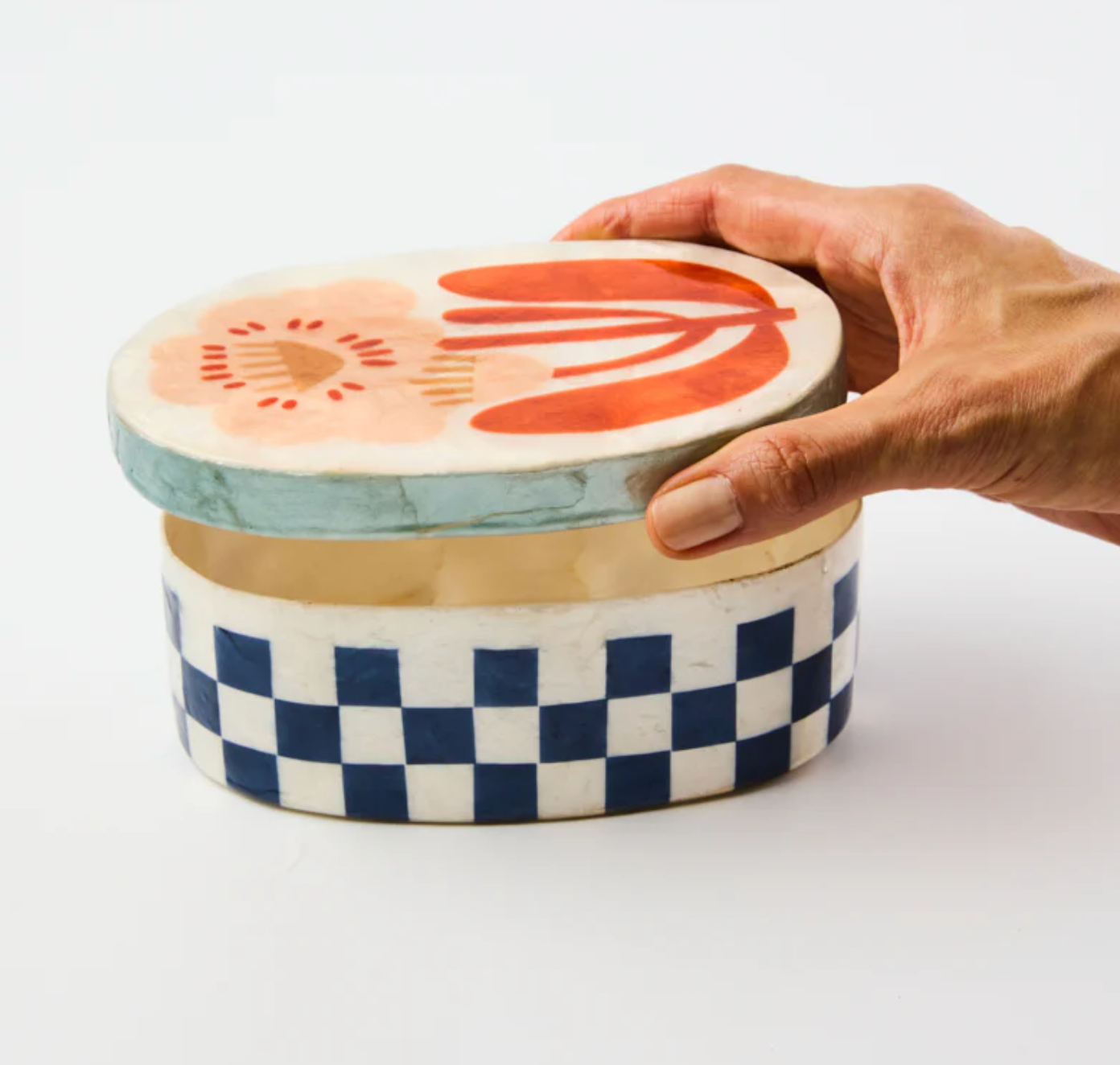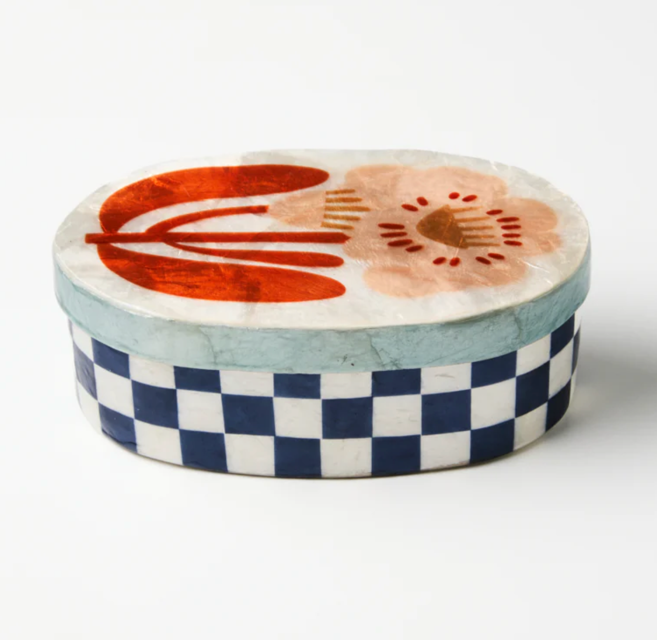 Deep maritime blue checks give this generous Capiz shell box sophisticated presence on vanities and shelves. Designed in Sydney and hand-crafted by skilled artisans, each piece celebrates the natural luminosity of the shell through rich colour, like the fun floral motif top. Perfect for organising jewellery, mementos, or special treasures while adding a touch of playful colour.