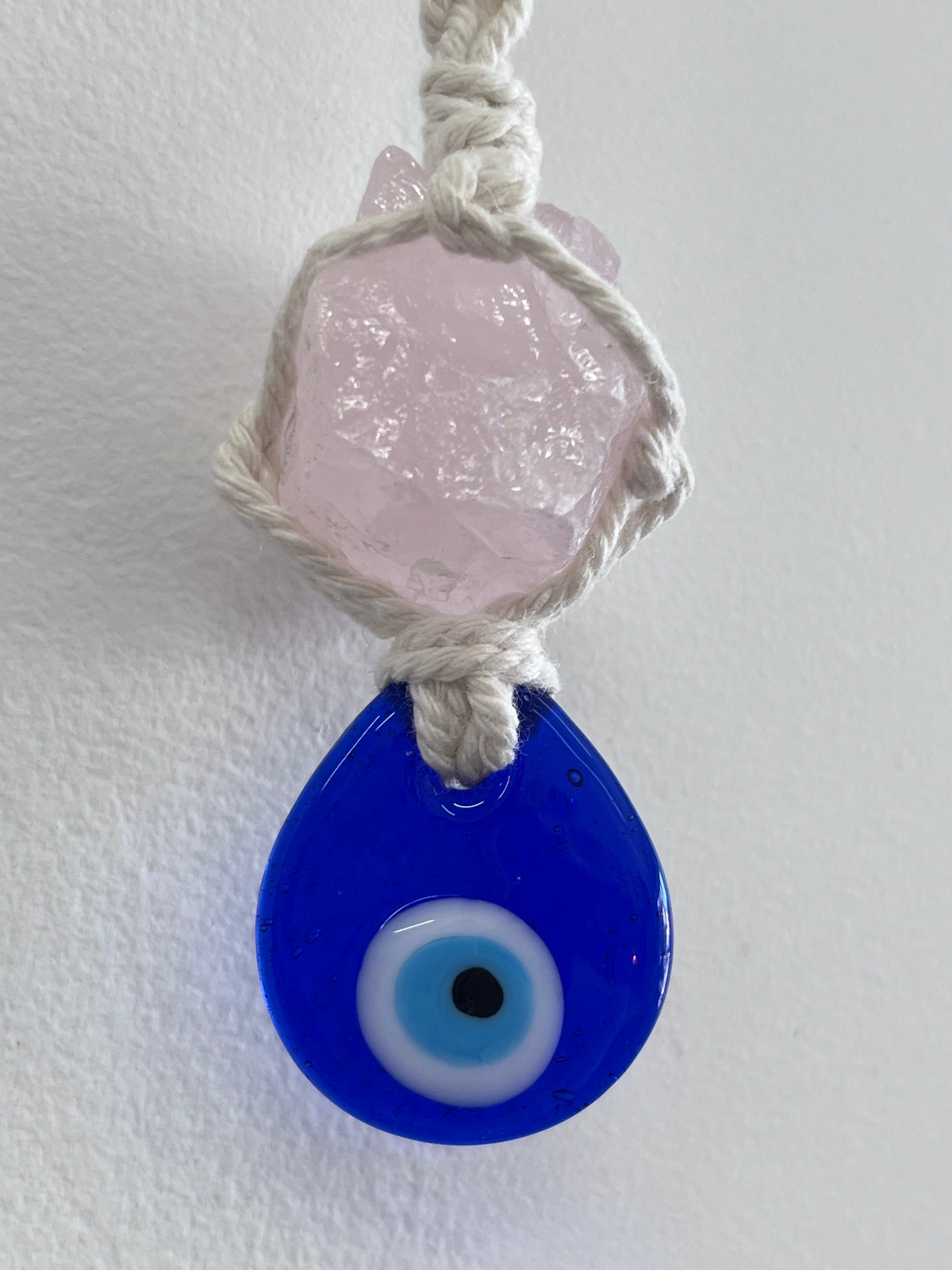 Handmade rope charm featuring a natural rose quartz Crystal for unconditional love and emotional healing, paired with a traditional blue evil eye talisman for protection and warding off negative energy.